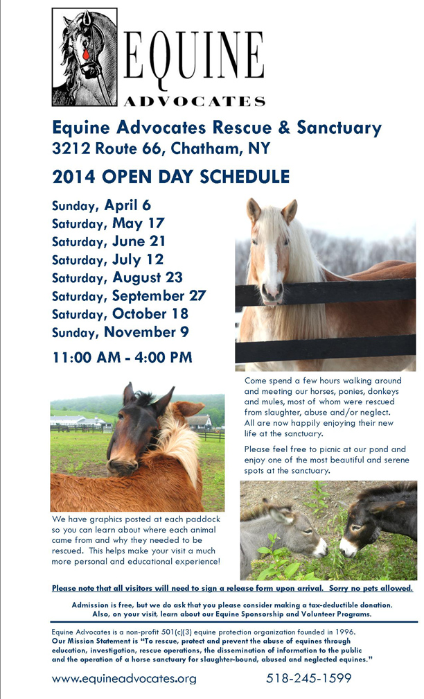 Come meet our amazing 85 rescued horses, ponies, donkeys, and mules, and two pygmy goats, on one or more of our 2014 Open Days! Our first Open Day is scheduled for Sunday, April 6. There is plenty of time to plan your visit, so please mark your calendars. We know you will have a wonderful experience!