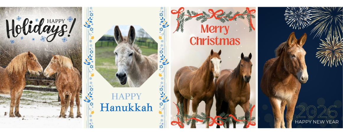 Give a Gift Donation in the name of someone special, and we will send that person a card of your choice (minimum $25 donation for cards) and include a special message from you! The funds go toward the 80+ rescued horses, ponies, donkeys, and mules that live at our 173-acre sanctuary in Chatham, New York.