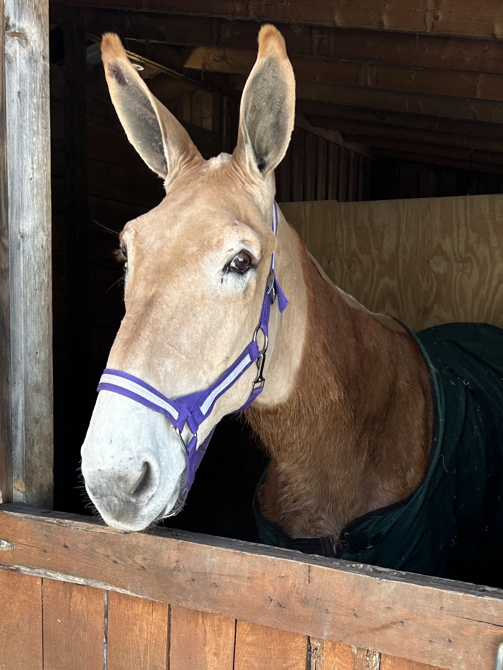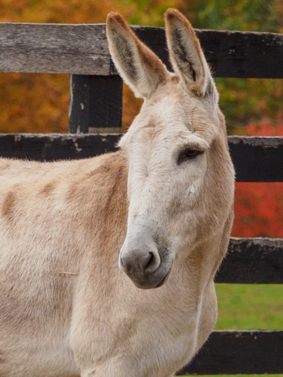 Babe, born around 1991, is a former Work Mule from western Pennsylvania. She and her sister Belle were involved in an accident while pulling a plow, and Belle was injured. Both were about to be sold at a slaughter auction when Equine Advocates came to their rescue and purchased them in 2001. Sadly, Belle passed away on March 23, 2021. Babe spends her days with another mule in an area of the sanctuary we call “Comedy Central.”