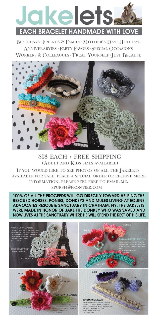Today, Jake is doing extremely well and loving all the attention he receives each day from our doting staff and volunteers. Sybille has become a great friend of this organization and has come up with a wild and wonderful idea of creating a new line of bracelets which she calls, “Jakelets,” lovingly inspired by Jake the Donkey and designed to help raise money for Equine Advocates. Please check out her amazing creations below! They are just fantastic and great as gifts.