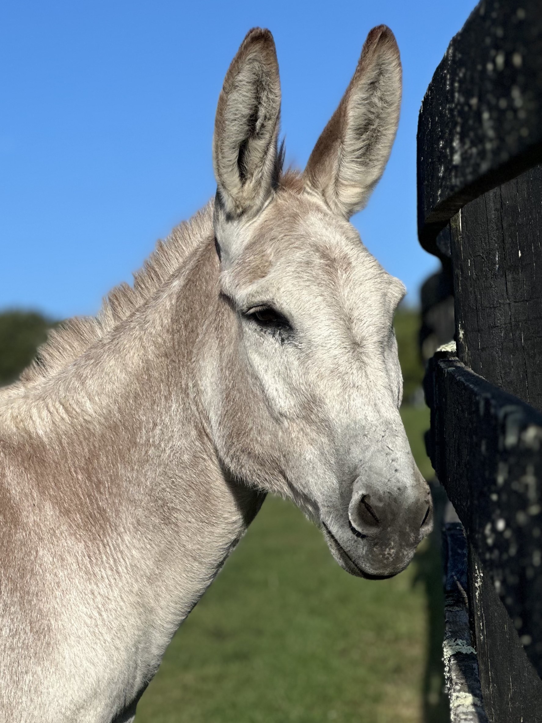 People without the patience or skill to deal with what they consider to be a difficult equine often become frustrated and dump their animals at low-end meat auctions. Donkeys are highly intelligent but, like all equines, will develop behavioral problems if abused or mishandled. Photos of Jasper at the time of his rescue document that he was badly neglected and in terrible shape. Donkeys who suffer this kind of abuse often develop lasting scars that require humane treatment and lots of TLC to rebuild trust. Fortunately for Jasper, he was saved and introduced to a Pony named Blue, who became his pasture mate and best friend. They arrived at the sanctuary together on April 24, 2025. Because we do not have an exact date of birth for Jasper, we will celebrate his birthday every May 16th in honor of National Horse Rescue Day.